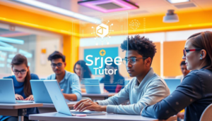 A futuristic classroom scene showcasing an engaging learning environment where students interact with holographic AI writing assistants, vibrant colours, modern technology aesthetics, diverse group of students focused on their screens, the logo “Srijee Tutor” subtly integrated into the design of the AI interface, bright and inspiring atmosphere, emphasizing collaboration and creativity in education.
