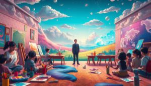 A surreal landscape depicting a vibrant classroom where traditional art supplies and digital interfaces coexist, illustrating the duality of inspiration and dependence. On one side, students are engaged in hands-on creativity with paintbrushes and canvases, while on the other, they interact with holographic screens displaying AI-generated artwork. The scene captures the contrasting emotions of joy and confusion as vibrant colors blend with digital elements. In the background, a faint silhouette of a guiding figure symbolizes mentorship, representing “Srijee Tutor” as a supportive influence in fostering creativity.