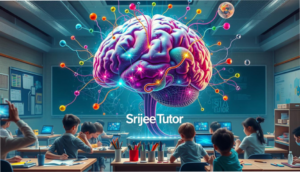 A surreal scene depicting a giant AI brain with colourful neural connections, surrounded by students engaging creatively with various art supplies, brushes, and digital devices; vibrant colours symbolizing imagination and innovation, set against a futuristic classroom backdrop. The brand “Srijee Tutor” subtly integrated into the environment, perhaps as a holographic element or part of the classroom design.